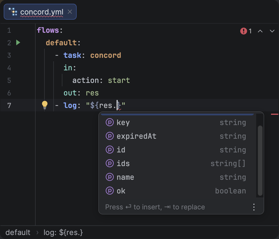 After typing a dot in an expression (e.g. ${initiator.}), the plugin suggests available sub-properties based on the variable's schema. This works for built-in variables, task output, and any variable whose structure can be inferred from the YAML.