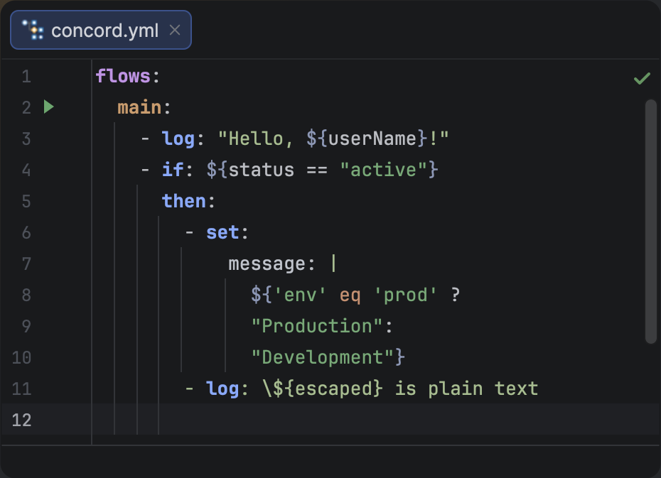 The Concord IntelliJ Plugin goes beyond standard YAML highlighting. It understands the structure and semantics of your Concord files, applying specific colors to different parts of the flow to improve readability.