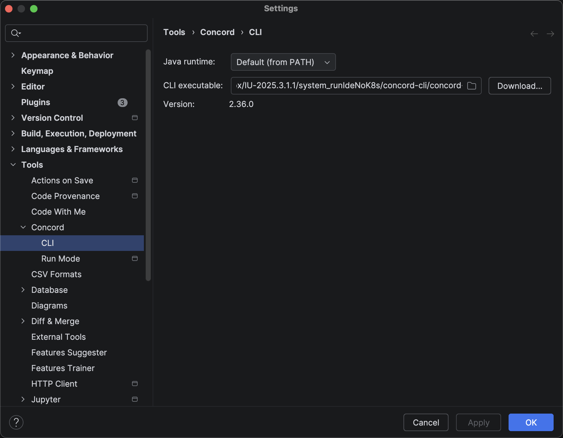 - Download: Click "Download..." to fetch the CLI directly from Maven Central. The plugin will download and configure it automatically.