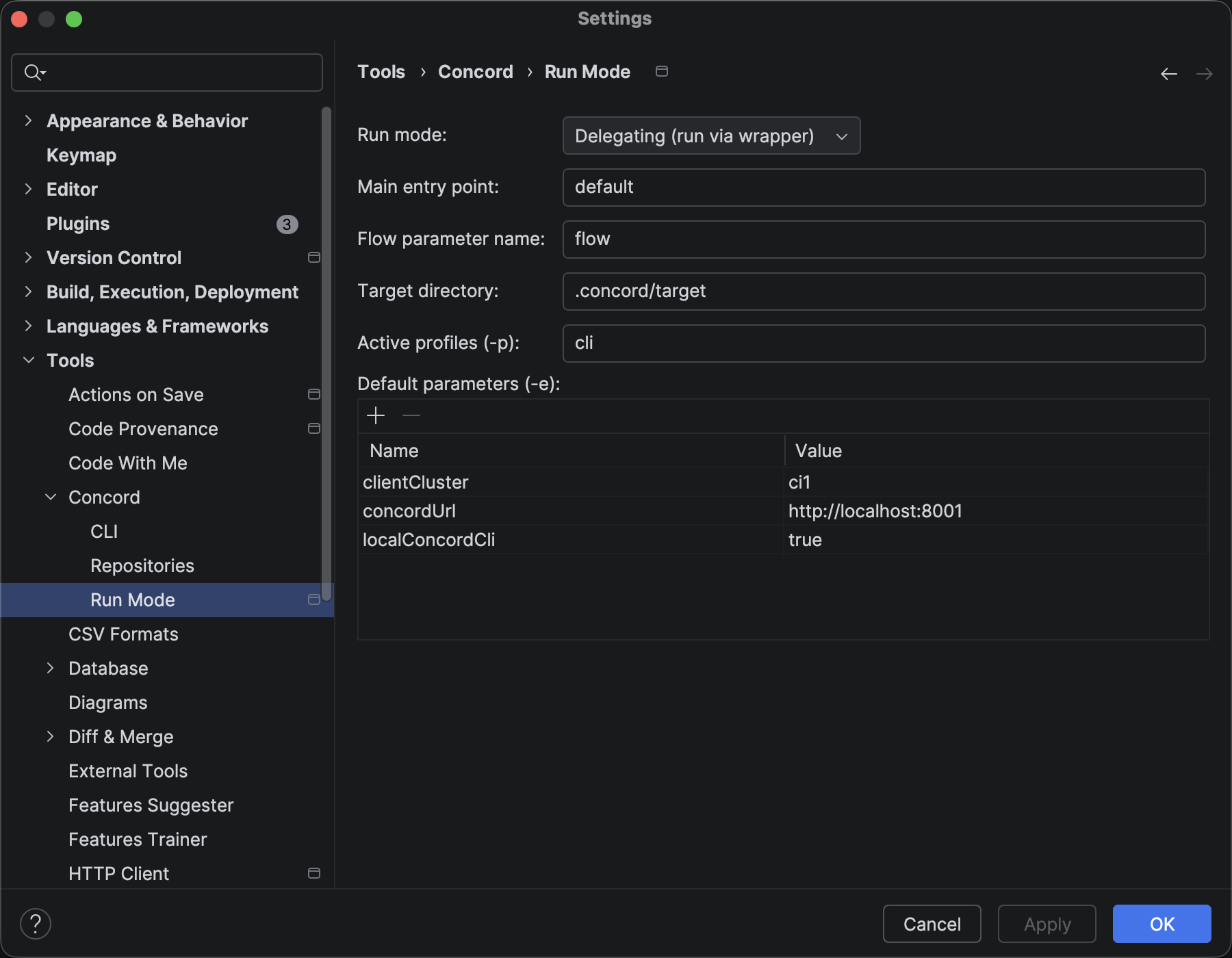 The plugin supports two distinct execution modes, which can be configured globally in Settings | Tools | Concord Run Mode.